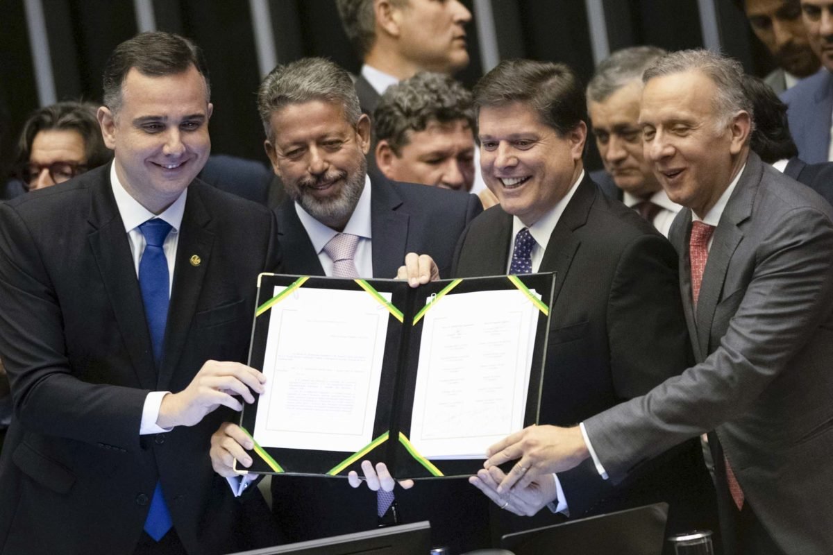 “O dia de hoje ficará marcado na história nacional. Será lembrado não apenas como um marco histórico, mas também como um ponto de virada, um divisor de águas. Esse dia representa o início de um novo país rumo ao progresso. É uma conquista do Congresso Nacional, uma conquista do povo brasileiro”, frisou Pacheco.